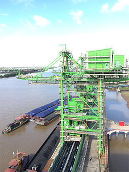 橋式抓斗卸船機,以帶有抓斗的小車沿橋架作周期運行的散貨卸船機。作業(yè)時,抓斗自船艙抓取散貨并提升出倉后載重小車向岸方運行,將散貨卸入前門框內(nèi)的漏斗內(nèi),經(jīng)膠帶輸送機系統(tǒng)送入貨場。