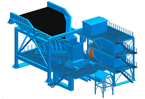 雙齒輥半移動(dòng)破碎站用于千萬(wàn)噸級(jí)以上大型露天礦原煤及剝離物的初級(jí)破碎,其開(kāi)采工藝一般為單斗挖掘機(jī)—運(yùn)輸汽車(chē)—半移動(dòng)破碎站—膠帶機(jī)。利用汽車(chē)運(yùn)輸?shù)撵`活性,縮短了汽車(chē)運(yùn)距,又發(fā)揮了帶式輸送適用于長(zhǎng)距離運(yùn)輸、生產(chǎn)率高、成本低、維護(hù)量小、安全可靠的特點(diǎn),同時(shí)可隨開(kāi)采推進(jìn)定期遷移,機(jī)動(dòng)靈活。