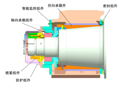 軋機(jī)油膜軸承可分為動(dòng)壓和靜動(dòng)壓兩種,選型根據(jù)軋機(jī)具體工況決定。其油膜軸承結(jié)構(gòu)主要由徑向承載件、軸向承載件、密封組件、鎖緊組件、防護(hù)組件、智能監(jiān)控組件等組成。 徑向承載組件中錐套有無(wú)鍵和無(wú)鍵薄壁兩種形式,靜動(dòng)壓襯套有單油腔、雙油腔和四油腔三種形式;軸向承載組件有單止推和雙止推兩種形式;密封組件有JF密封和ACS密封兩種形式;鎖緊組件有機(jī)械鎖緊、液壓缸鎖緊兩種形式,用戶(hù)可根據(jù)不同需求,各種形式自由組合