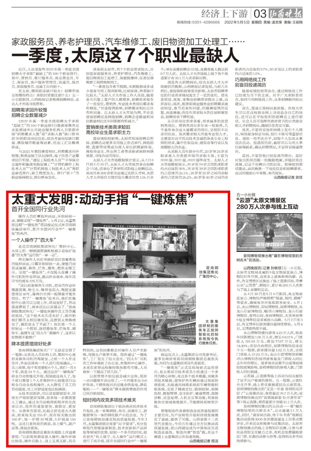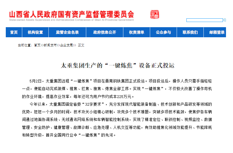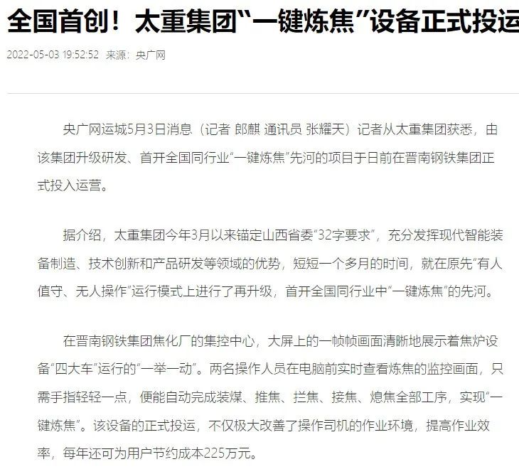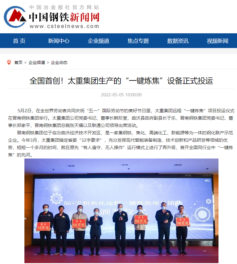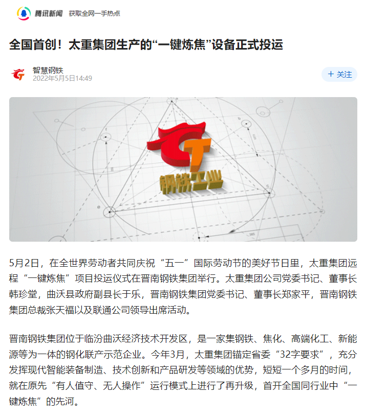 央廣網(wǎng)、中國鋼鐵新聞網(wǎng)、騰訊以《全國首創(chuàng)!太重集團“一鍵煉焦”設(shè)備正式投運》為題,聚焦太重集團以科技創(chuàng)新激發(fā)“智造”新活力為出發(fā)點,全面展示“智能+5G”在“一鍵煉焦”上的應(yīng)用,助力焦化領(lǐng)域效能提升、節(jié)能降耗和轉(zhuǎn)型升級。中國經(jīng)濟網(wǎng)、網(wǎng)易、山西國資以《太重集團“一鍵煉焦”設(shè)備正式投運》為題,報道太重集團“一鍵煉焦”項目正式開啟智能煉焦新時代,填補技術(shù)空白,開創(chuàng)國內(nèi)焦化行業(yè)先河。搜狐網(wǎng)以《環(huán)境好了,效率高了,收益漲了!太重首創(chuàng)“一鍵煉焦”項目投運》為題,重點展示了太重集團“一鍵煉焦”項目成果,實現(xiàn)智能綠色工廠轉(zhuǎn)型再升級。山西日報、山西晚報、太原日報分別以《首開全國同行業(yè)先河!太重“一鍵煉焦”項目投入運行》《太重大發(fā)明:動動手指“一鍵煉焦”》《太重首創(chuàng)“一鍵煉焦”項目投運》為題,聚焦太重“智造”再提速,充分展現(xiàn)公司以“三性五化”為新產(chǎn)品開發(fā)目標,助力國家實現(xiàn)“雙碳”目標。