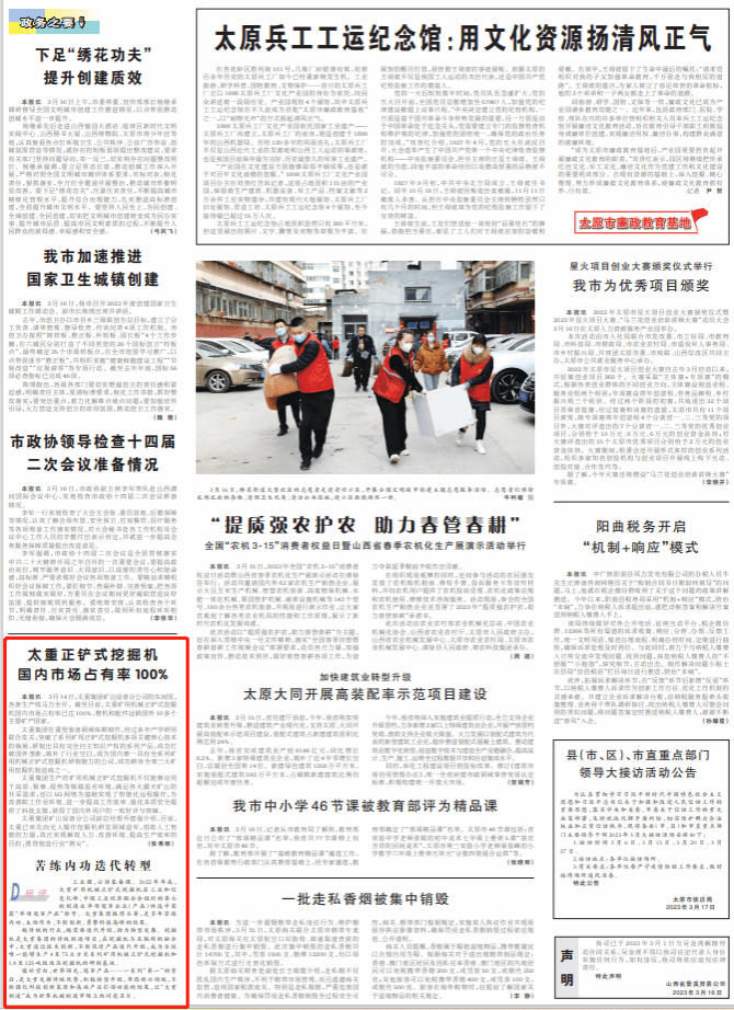 近期,太原日?qǐng)?bào)以《太重正鏟式挖掘機(jī)國內(nèi)市場(chǎng)占有率100%》為題對(duì)太重集團(tuán)礦用挖掘機(jī)勇登行業(yè)“塔尖”進(jìn)行報(bào)道。太重集團(tuán)大力實(shí)施科技創(chuàng)新和人才強(qiáng)企戰(zhàn)略,堅(jiān)持把創(chuàng)新擺在公司轉(zhuǎn)型發(fā)展全局的核心位置,為太重在全省轉(zhuǎn)型發(fā)展中發(fā)揮龍頭帶動(dòng)作用聚力賦能。