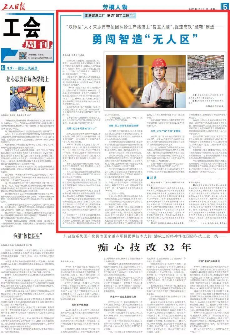 近日,《工人日報》對太重軌道公司設(shè)備能源室技術(shù)主辦宋志偉勇于創(chuàng)新、勇闖智造“無人區(qū)”,為高鐵打造合格“跑鞋”的先進(jìn)事跡進(jìn)行了聚焦報道。從覺醒成為一名新時代的工人到“雙師型”人才的突破,再到勇闖“無人區(qū)”,為生產(chǎn)線裝上了“智慧大腦”,宋志偉不斷攀登科研技術(shù)高峰,攻克多項科技創(chuàng)新難點,不斷用熱情和力量踐行著強(qiáng)國有我的青年擔(dān)當(dāng)。