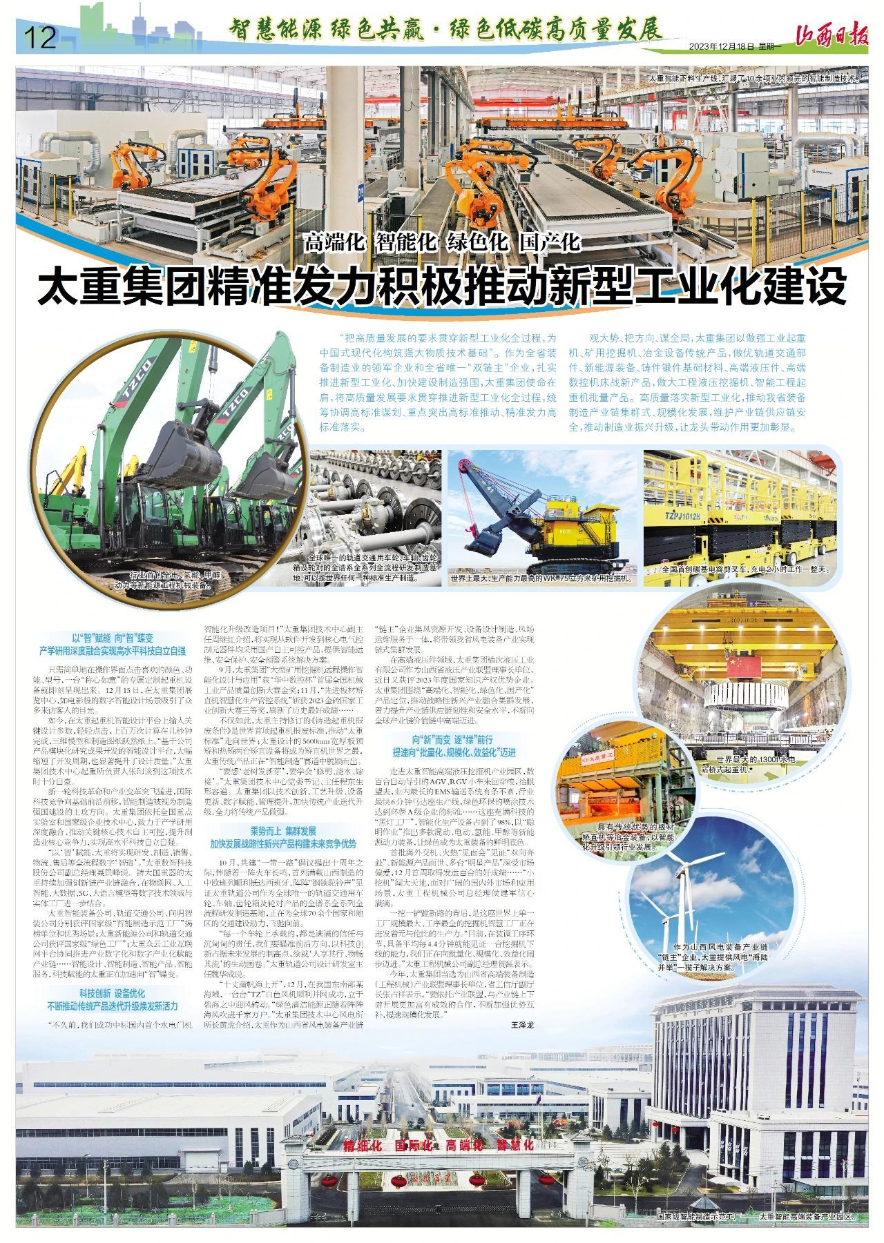 今日,山西日報整版刊發(fā)《高端化 智能化 綠色化 國產(chǎn)化 太重集團精準發(fā)力積極推動新型工業(yè)化建設》文章,從產(chǎn)學研用深度融合、傳統(tǒng)產(chǎn)品迭代升級、加快發(fā)展戰(zhàn)略性新興產(chǎn)品、打造綠色批量裝備等方面,詳細報道太重高質(zhì)量落實新型工業(yè)化的生動實踐,講述公司作為全省唯一“雙鏈主”企業(yè),持續(xù)推動我省裝備制造產(chǎn)業(yè)鏈集群式、規(guī)?;l(fā)展的務實之舉。