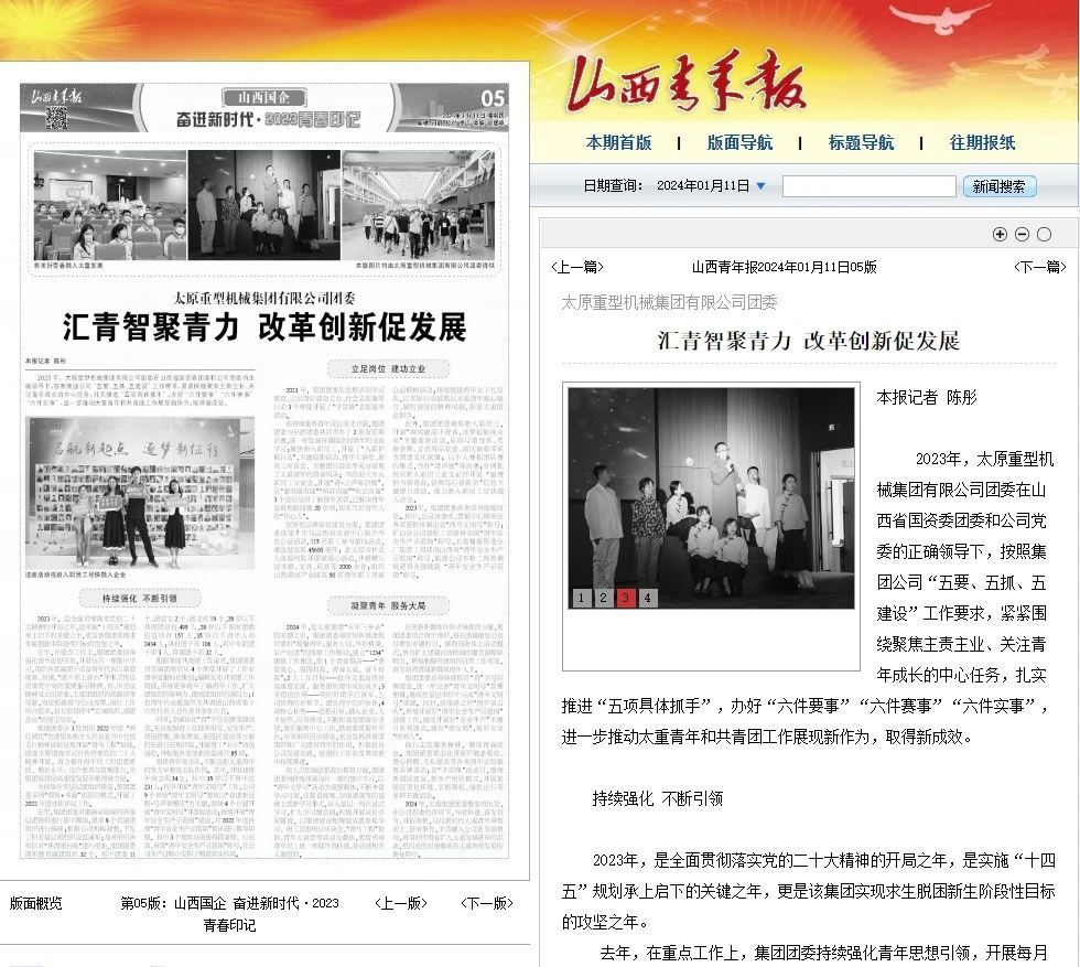 今日,山西青年報以《匯青智聚青力 改革創(chuàng)新促發(fā)展》為題,整版從“持續(xù)強化 不斷引領”“立足崗位 建功立業(yè)”“凝聚青年 服務大局”三個方面,對太重共青團2023年工作進行全面報道。
