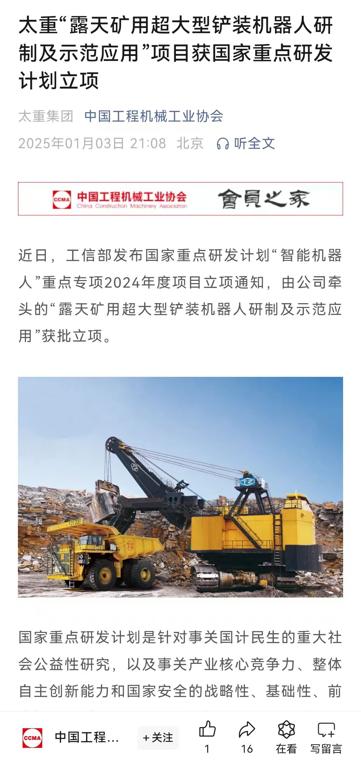 助力我國(guó)智慧礦山建設(shè),太重在行動(dòng)!近日,2024年度國(guó)家重點(diǎn)研發(fā)計(jì)劃立項(xiàng)結(jié)果公布,公司牽頭的“露天礦用超大型鏟裝機(jī)器人研制及示范應(yīng)用”獲批立項(xiàng)!太重集團(tuán)官微發(fā)布這一消息后,立刻受到人民日?qǐng)?bào)的重磅關(guān)注,彰顯出國(guó)家對(duì)太重科技創(chuàng)新能力的高度認(rèn)可。與此同時(shí),山西日?qǐng)?bào)、太原日?qǐng)?bào)、中國(guó)工程機(jī)械工業(yè)協(xié)會(huì)等主流媒體與行業(yè)平臺(tái)也迅速關(guān)注,紛紛轉(zhuǎn)發(fā)了太重這一重要突破,刷屏“朋友圈”!露天礦開采技術(shù)的全新智能化時(shí)代,在此啟航!