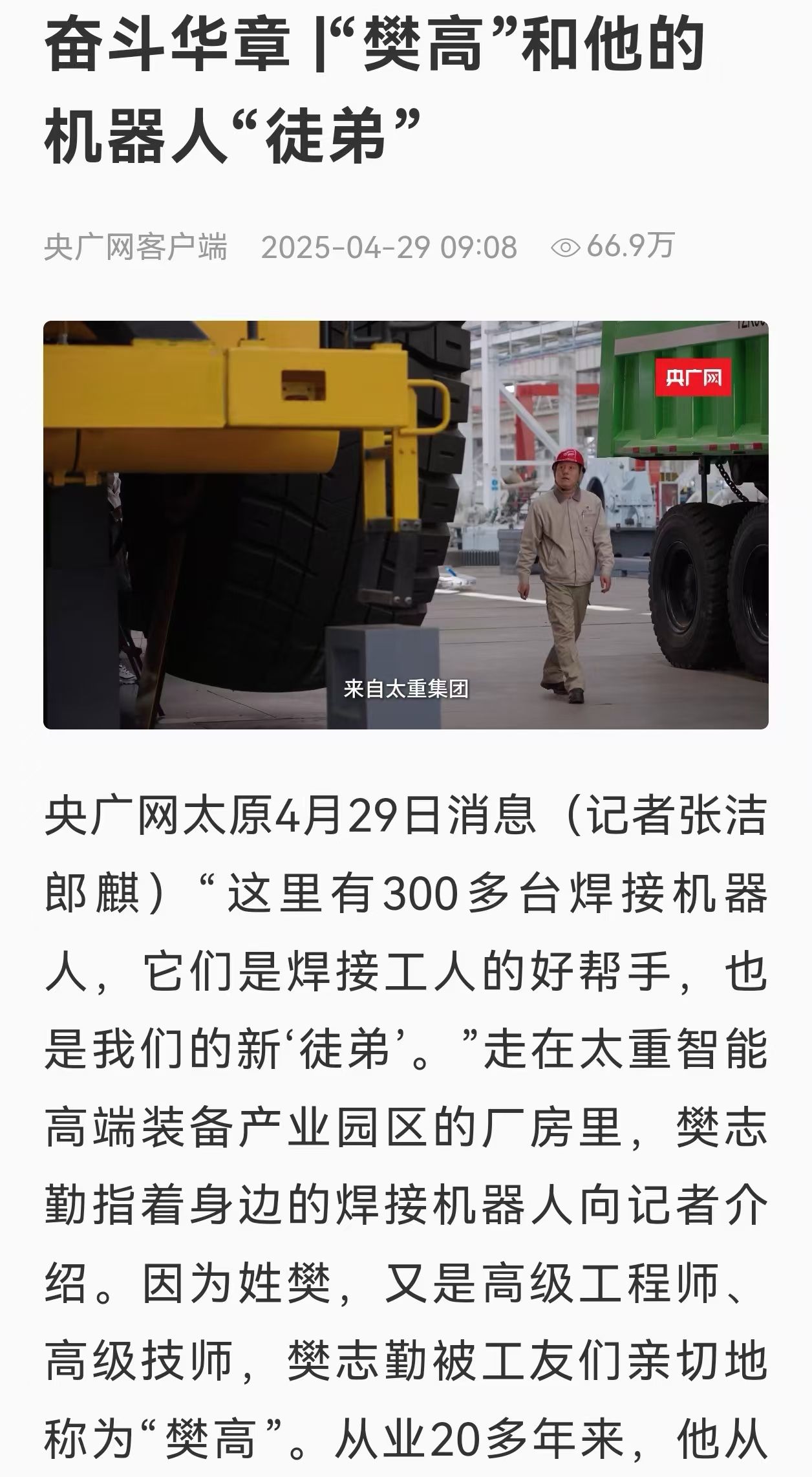 “五一”國際勞動節(jié)之際,央廣網發(fā)布專題視頻《奮斗華章|“樊高”和他的機器人“徒弟”》,聚焦太重集團全國勞模、大國工匠樊志勤,講